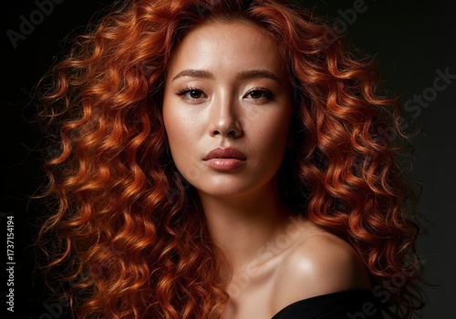 Radiant Beauty: An portrait of a woman with vivacious, coppery red curly hair, a stunning gaze and natural skin