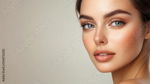 Radiant Beauty: Close-up portrait of a captivating woman with striking features, accentuated by expertly applied makeup, exuding a timeless and glamorous aesthetic.
