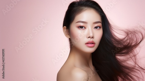 Radiant Beauty Portrait: A stunning young woman with flawless skin and long, flowing dark hair gazes directly at the camera, exuding confidence and natural beauty against a soft pink backdrop.