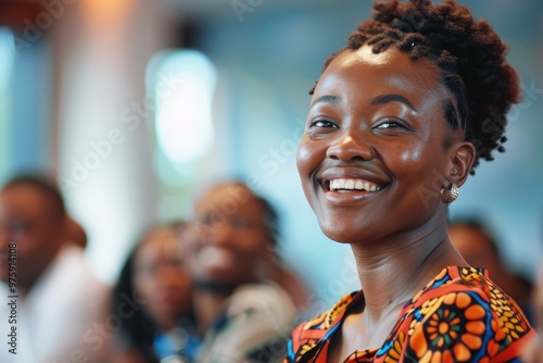 Radiant Confidence: A young Black woman beams with joy, her infectious smile radiating warmth and positivity against a blurred backdrop of a diverse gathering.
