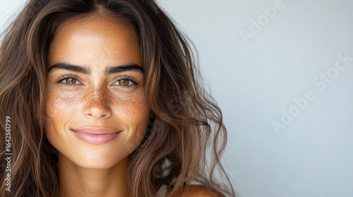 Radiant Latina woman with freckles and long, wavy hair, smiling softly in natural light