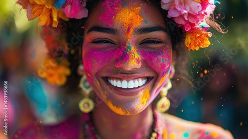 Radiant Smile, Celebrating Holi with Vibrant Colors and Floral Adornment