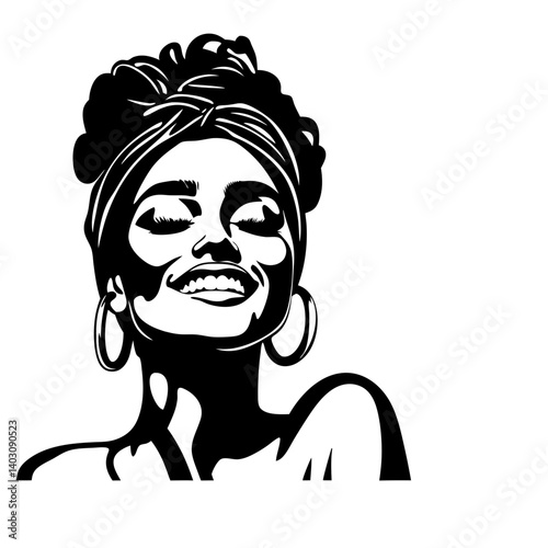 Radiant Smiling Woman with Headwrap Elegant Black and White Vector Art for Creative Projects