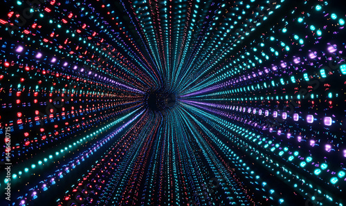 Radiant tunnel. A dark vortex with vibrant, colored lights extending toward the center in rows, creating a mesmerizing, futuristic ambiance