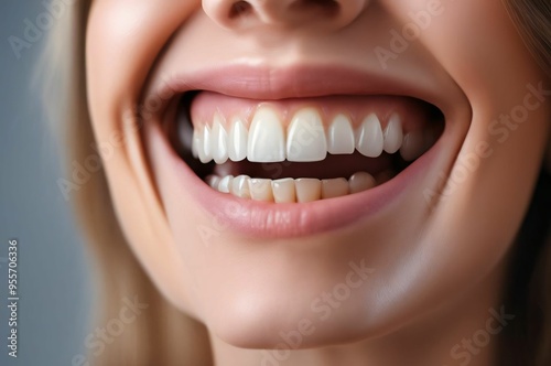 Radiant white smile from teeth whitening treatment. Smile with white healthy teeth of young woman. Close up of a woman's smile. Dental health and oral hygiene.