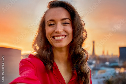 Radiant Woman in Red Smiling at Golden Hour Cityscape