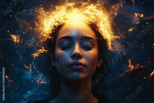 Radiant woman meditating in space, illustrating mental health and self awareness on dark blue