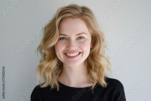 Radiant young woman with wavy blonde hair and blue eyes, smiling in a black top, exuding confidence and joy.