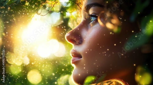 Radiant young woman's profile in nature's embrace.