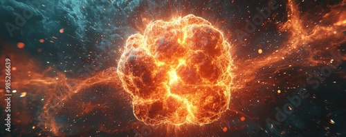 Radiation emitted during nuclear fission, with energy waves and atomic particles scattering in all directions.