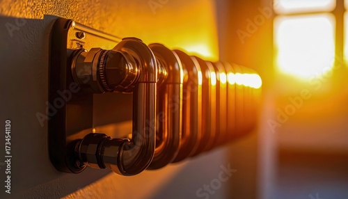 Radiator detail in closeup glowing with sunset, nostalgic household seasonal comfort, domestic heating appliance photographed with artistic warm composition and modern aesthetic visual charm.