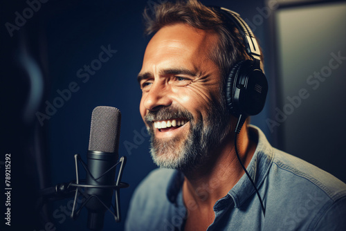 Radio podcast deejay near microphone recording news song program live broadcasting Generative AI