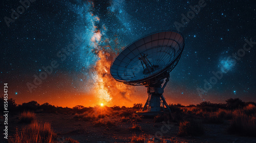 radio telescope under milky way galaxy at night, space exploration and astronomy concept