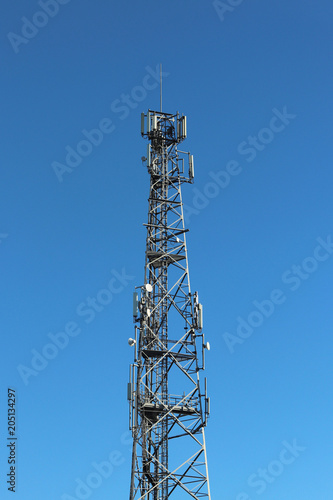 Radio tower with antennas on a blue sky background. Metal construction. Technology building. The technology of wireless information transmission from a distance.