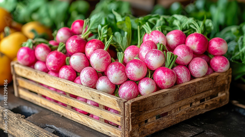 Radishes in wooden box. Freshly picked root vegetables. Farm market harvest.