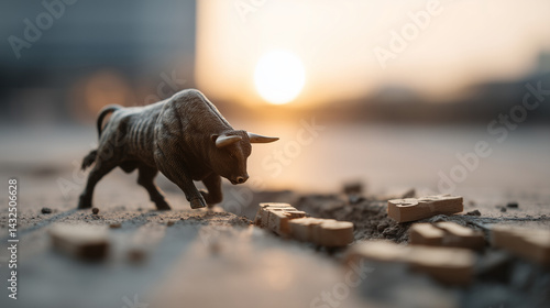 Raging Bull Silhouette: A symbolic representation of strength, determination, and financial markets, featuring a bull silhouetted against a vibrant sunrise or sunset backdrop.