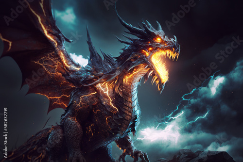 Raging dragon with dark thunderclouds in the back, Generative AI