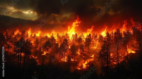 Raging Wildfire Burning Through Forest Trees with Intense Flames