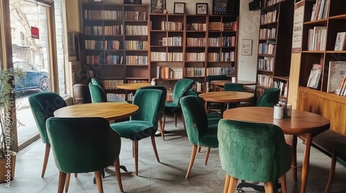 Rahva Raamat Bookstore Cafe. Wooden tables and velvet green seats provide a cozy ambiance.