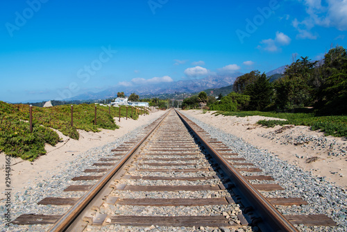 Railroad tracks converging in perpective into the distance towards distant mountains