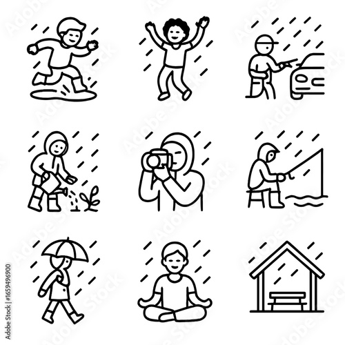 Rain Activities Icons. Outline icon set of rain related activities: puddle jumping, rain dance, washing car, gardening in rain,