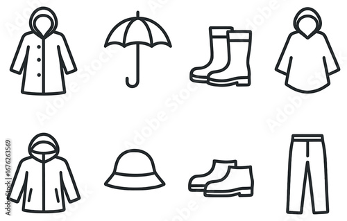 Rain gear linear icon set. featuring raincoat, umbrella, boots, poncho, and hat symbols