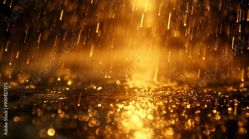 rain pouring down, creating a shimmering pathway on a wet surface. The rain droplets are captured in motion, creating a mesmerizing effect. The light from above illuminates the droplets