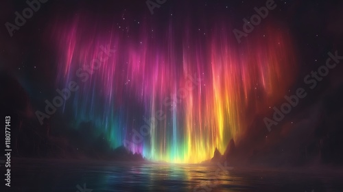 Rainbow Aurora Borealis Over Dark Water and Mountains