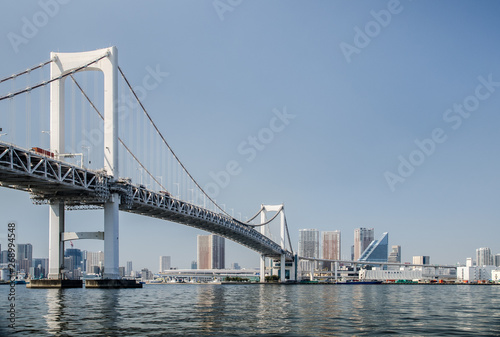 Rainbow Bridge is a bridge on Tokyo Bay between Shibaura Pier and the Odaiba waterfront. Tokyo, Japan.