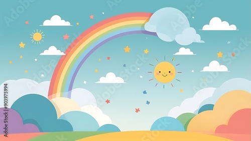 Rainbow, clouds, sun, stars, blue sky in paper cutout style. Suitable for greeting cards, posters, childrens books, and backgrounds.