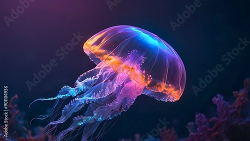 Rainbow jellyfish illuminating swimming in the deep ocean. 3d rendering with copy space. Beautiful life of underwater creature, tranquility undersea concept