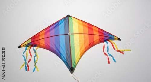 Rainbow kite with tassels floats against a soft, diffused gray backdrop