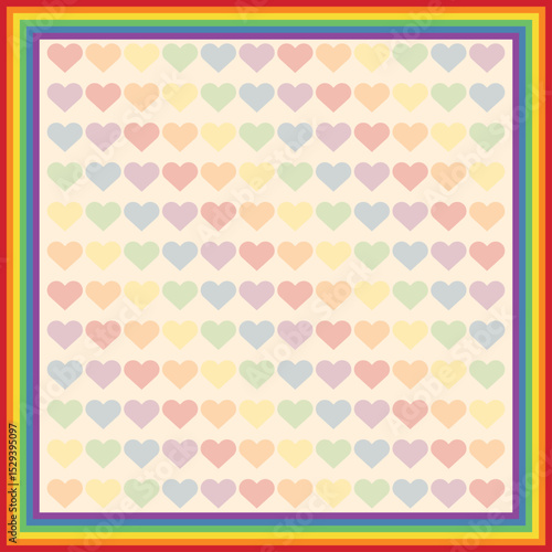 Rainbow LGBTQIA+ flag frame with colorful hearts in the background