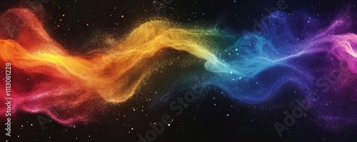 Rainbow noisy grainy poster design, abstract vibrant background, yellow blue orange red purple color flow wave, black backdrop noise texture banner