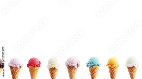 Rainbow of Ice Cream Cones: A vibrant line of colorful ice cream scoops in crispy cones, arranged in a row, offering a playful and refreshing treat for any summer occasion.