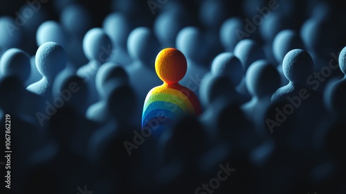 Rainbow shape stands out among blue shapes on a blurred dark background, conveying uniqueness and individuality in a crowd competing for attention.