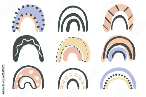 Rainbow symbols, cute hand drawn icon set, doodle black ink brush stroke pictogram, decorative cartoon sketch childish style, pastel boho colored isolated elements. Vector