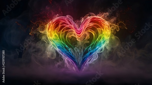 Rainbow-colored hearts hovering, hazy smoke swirling upward. Mysterious dark background,