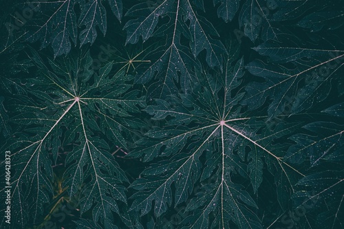 Raindrop on Papaya Leaves in Dark Tone Background.