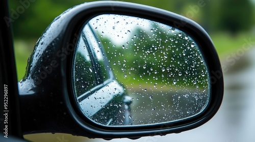 Raindrops on a car's side mirror obscure the view, representing the difficulty of navigating in inclement weather.