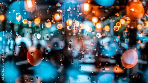 Raindrops on a window pane with blurred city lights in the background.
