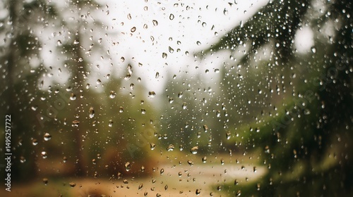 Raindrops on a window pane with trees blurred, concept of rain and melancholy