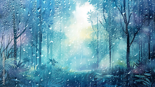 raindrops on the window pane tropical rain in the jungle, watercolor drawing background light white and green