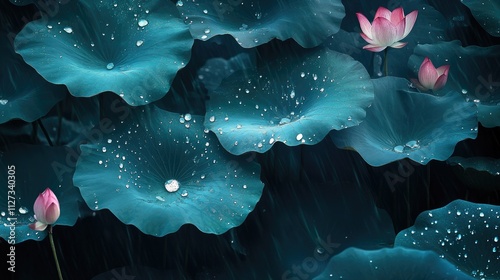 Raindrops on vibrant lotus leaves with pink blossoms under soft natural light in serene aquatic setting