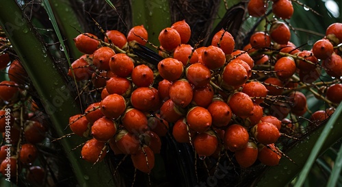 Rain-Kissed Palm Fruits: A Vibrant Cluster of Red Palm Berries