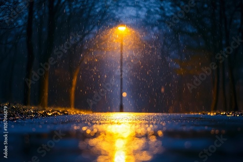Rain-soaked pavement reflecting a streetlight in a forest at night.