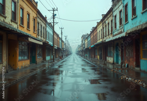 Rain-Soaked Urban Street Reflecting City Lights in Wet Asphalt Surface