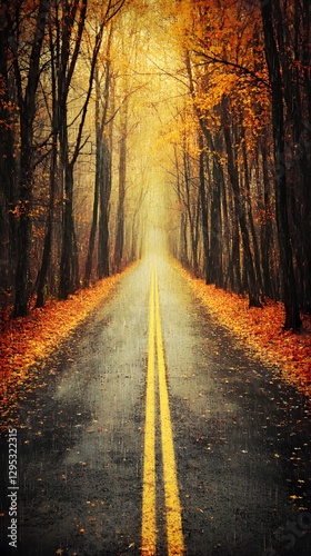 Rainy Autumn Road Through Golden Forest