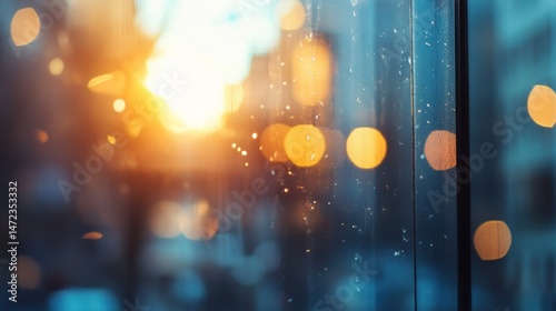 Rainy evening city lights blurred through wet window pane, warm sunset glow, bokeh effect, urban scene, atmospheric mood. : Generative AI