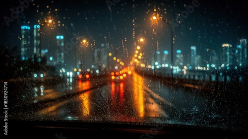 Rainy night city drive: blurred lights through a wet car windshield